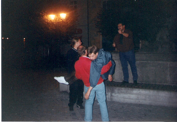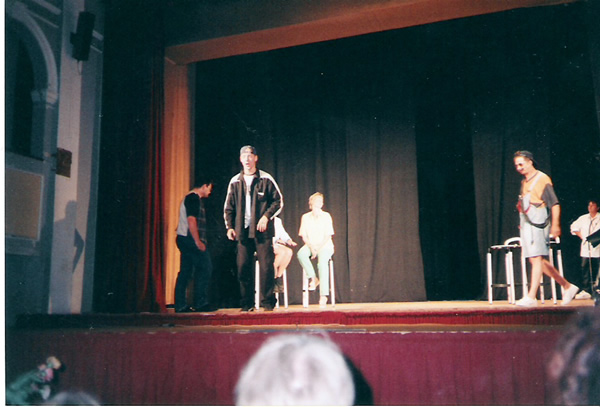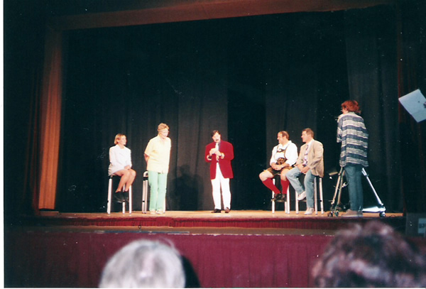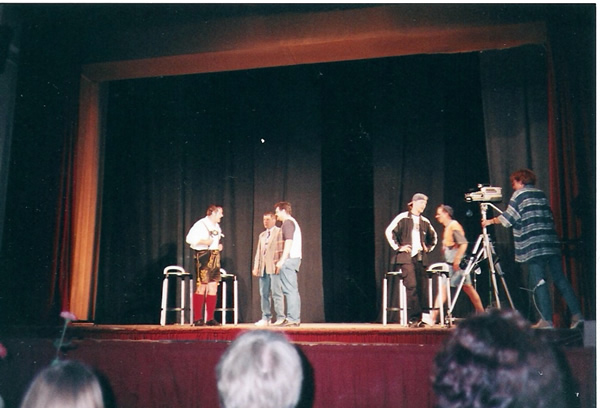 | Das TV – Quiz „Franken g’winnt“ gastiert in der Dorfturnhalle. Freddy Windel, der Moderator hat nur Augen für die weiblichen Kandidaten- die männlichen werden ungerecht behandelt, bekommen viel schwerere Fragen, oder deren Antworten werden als ungültig gewertet. Zum Schluss lässt es sich dennoch nicht vermeiden, dass die Männer gewinnen. Sie bekommen als ersten Preis einen vierwöchigen Aufenthalt in einer Tropfsteinhöhle, die Damen als zweiten „nur“ 14 Tage Mallorca mit Freddy. Wie es sich für eine Fernsehsendung gehört, darf auch die Werbung nicht fehlen – das Publikum wird mit einbezogen. („Mhm, fränkischer Backsteekäs, mhm, der schmeckt.“) |